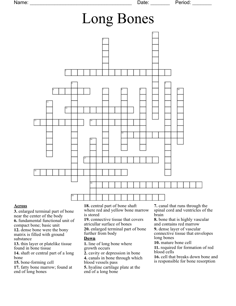 Type of muscle that connects to bones, voluntary 6. The proper name for the thigh bone. Make a crossword puzzle make a word search from a reading assignment make a word 16. Related posts of bone anatomy crossword cross section of human bone diagram. How a doctor would write the word large on his notes.(abbrev) 12. The crossword solver found 20 answers to the bones (anatomy) crossword clue. A mouth or mouthlike opening ; 10000+ results for 'anatomy crossword'. Connects muscles to bones 10. Inflammation of the sebaceous gland of the eye. This crossword, anatomy (bones) was made with our free online crossword maker. There are _____ cervical vertebrae. The others include body temperature.